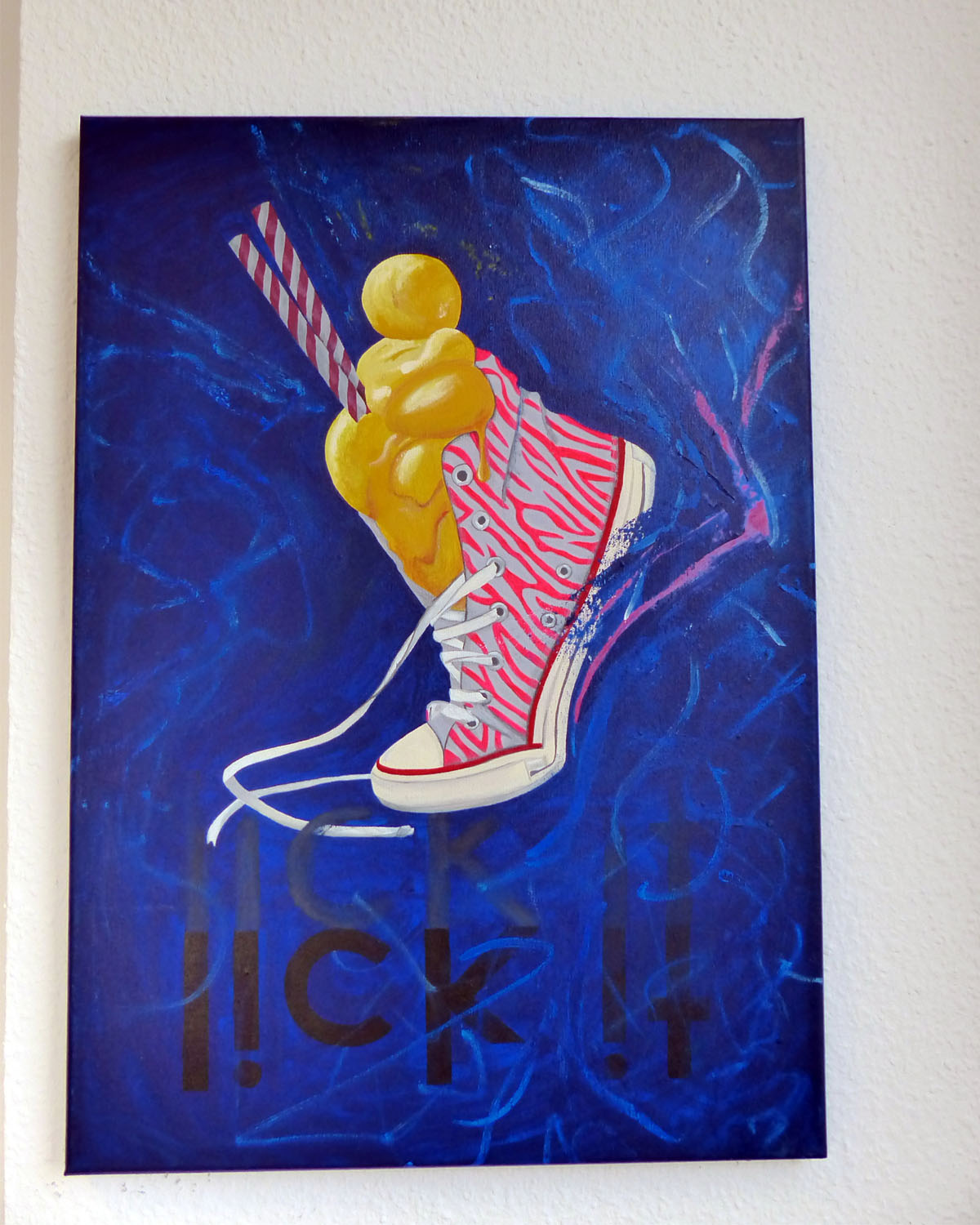 Der strahlend blaue Hintergrund verstärkt die Energie des Werks, lässt das Gelb des Eises noch leuchtender erscheinen und verleiht dem Ganzen eine fast traumhafte Schwerelosigkeit. Ist es ein Symbol für Freiheit? Ein Augenzwinkern an den schnellen Konsum? Oder einfach eine Hommage an die Schönheit unerwarteter Kombinationen?