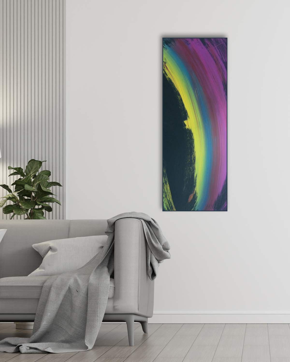 Ein dunkler Hintergrund, tief und mysteriös wie die Nacht, bildet die Bühne für ein faszinierendes Farbenspiel. Von oben nach unten zieht sich ein fließender Bogen aus sanftem Violett der Dämmerung, tiefem Ozeanblau, lebendigem Smaragdgrün und strahlendem Sonnengelb über die Leinwand – ein Übergang von Tiefe zu Licht, von Ruhe zu Energie.